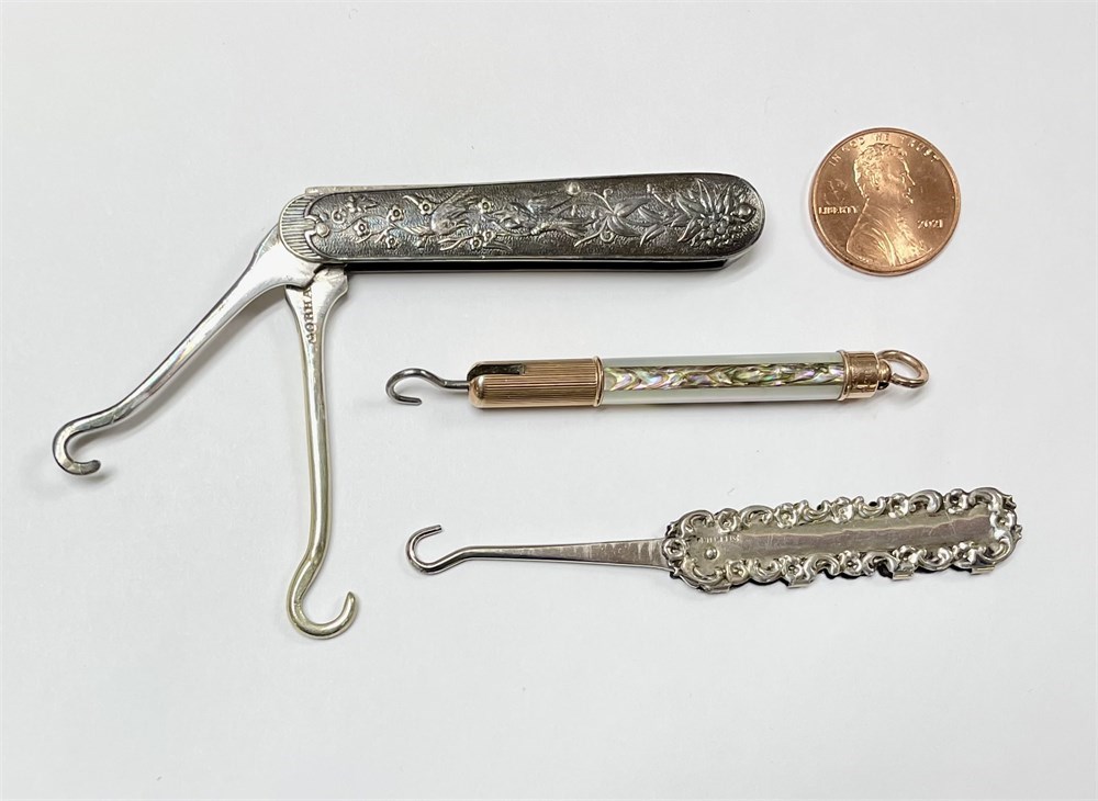Folding Buttonhooks, Silver/Gorham, and Retractable Purse Size Button Hook