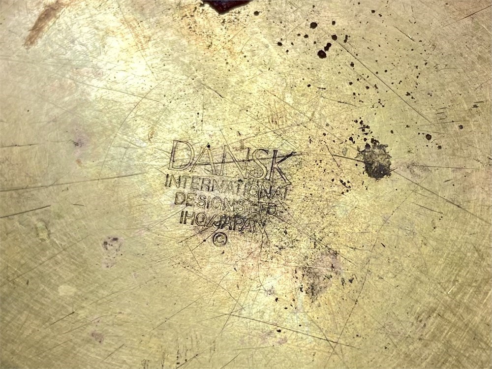 A brass kettle marked S & Co., with warmer stand.  A candleholder base by Dansk.  A footed bowl with Russian(?) mark.