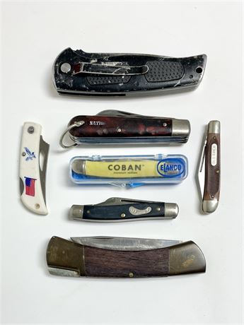 Assorted knives including Colonial, Schrade Old Timer, Frontier, Deerslayer, and an Imperial with Elanco advertising.  Everything for the bid.