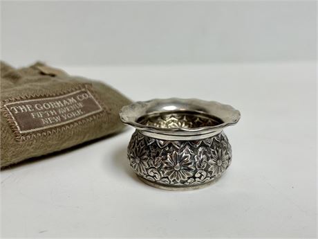 A silver repousse salt dip or cellar, about 1 3/4" diameter.  Good condition, and it's a sweet little piece, plus it has its old original bag from Gorham on Fifth Avenue in New York.  Marked Sterling; see pic.