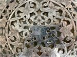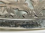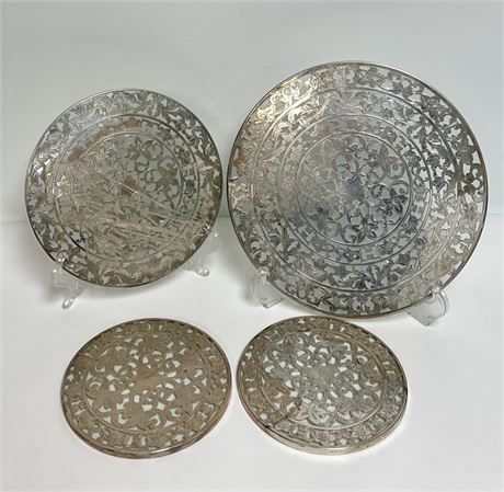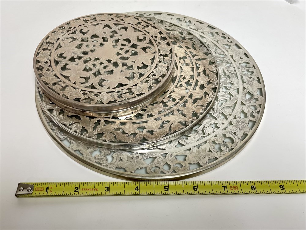 Set a luxurious table with 4 silver trivets.  These are glass with silver tops, marked Webster/Sterling.  They are 3 different sizes: 8", 6" and 4" (2 of these).  One of the small ones is monogrammed B; the others are plain.  We have not polished them; they were wrapped in plastic, thus the streaky look.
