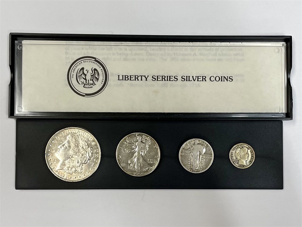 A set of 4 Liberty Series Silver Coins, assorted dates: dollar, half, quarter, dime.  (They do not stay in the display holder very well.)