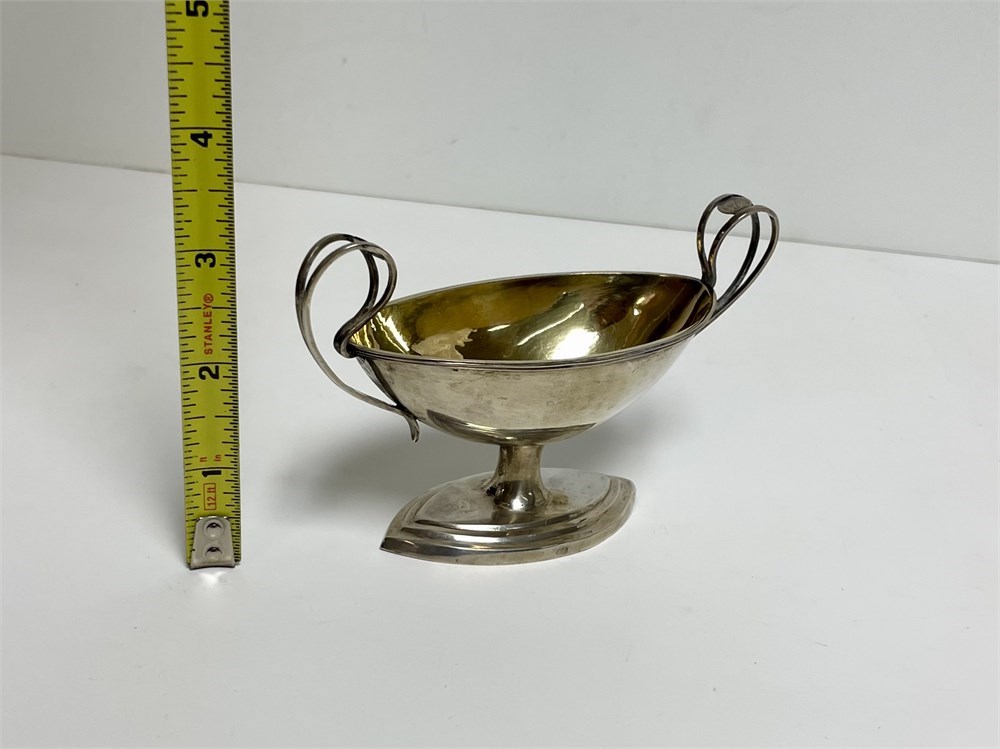 An antique double-handled salt bowl, hallmarked as sterling silver (lion mark).  It has an attractive gilt interior, and there are small initials B and F on the handles.