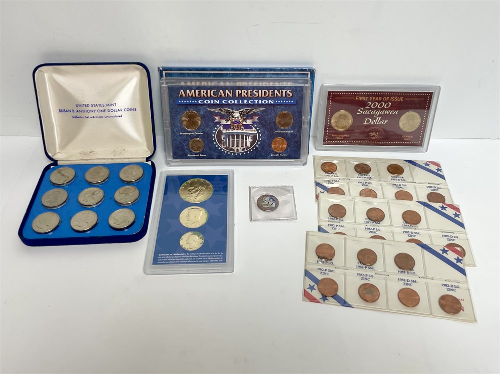 Lot includes:  a boxed set of 9 Susan B. Anthony dollars, an American Presidents display set of 4, a First Year of Issue 2000 Sacagawea dollar set of 2 (Philadelphia and Denver), a Bicentennial set of 24K gold layered coins (dollar, half, quarter) - see photos for condition, a colorized Bicentennial quarter, a display set of 21 U.S. cents.