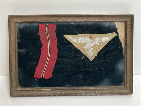 A tropical shirt eagle badge, and a medal ribbon, in a vintage frame together under glass, as pictured.