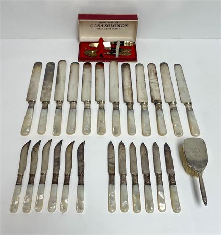3 Sets of Mother of Pearl Knives, Sterling Silver Baby Brush, Thailand Set
