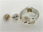 Hard-to-find lucite set, made with tiny seashells in it, and confetti colors.  A hinged clamper bracelet, and a pair of clip earrings.  Please note, one of the earrings is chipped.