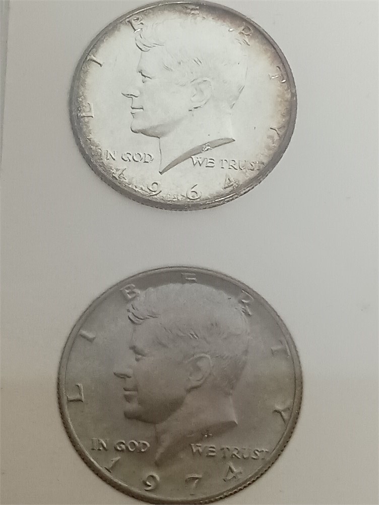 One silver 1964 Kennedy half dollar and 1974 Kennedy Half dollar with stamps cancelled in 1974.  Coins are exceptional quality.  In fact, the whole presentation is.  These are rare sets and hard to find any duplicates.