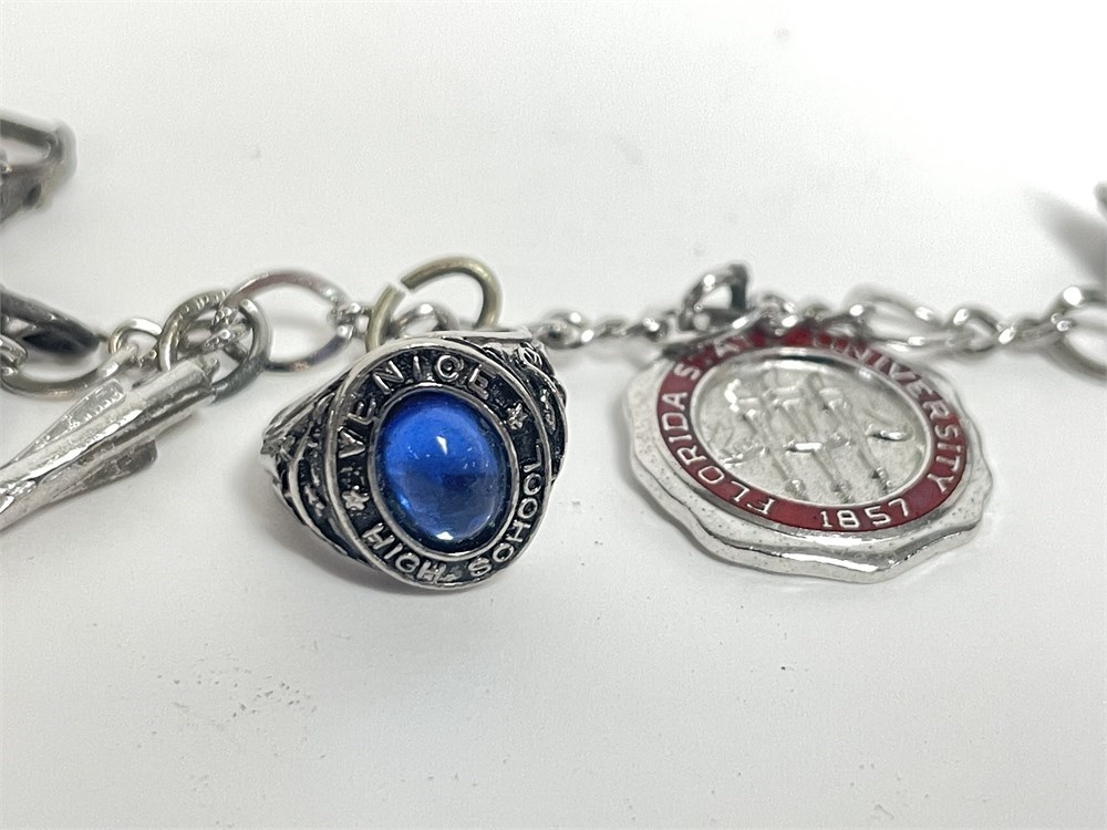 Lots of nostalgia here for local Venice High School grads.  There's also a Florida State charm, sewing machine, church, Nike missile, grand piano, tennis racket and various others.  The bracelet is marked Sterling and almost all of the charms are too.