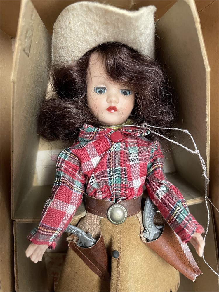 A wonderful find for a collector.  The adorable pair of dolls have original boxes, outfits, hats, guns, holsters, boots.  Each also has a Storybook pamphlet in the box, and the identification tag.  Their sleep eyes aren't working too well, and Roy's head is wobbly.  Still, condition is pretty good for their age, and even the boxes are in mostly good shape.