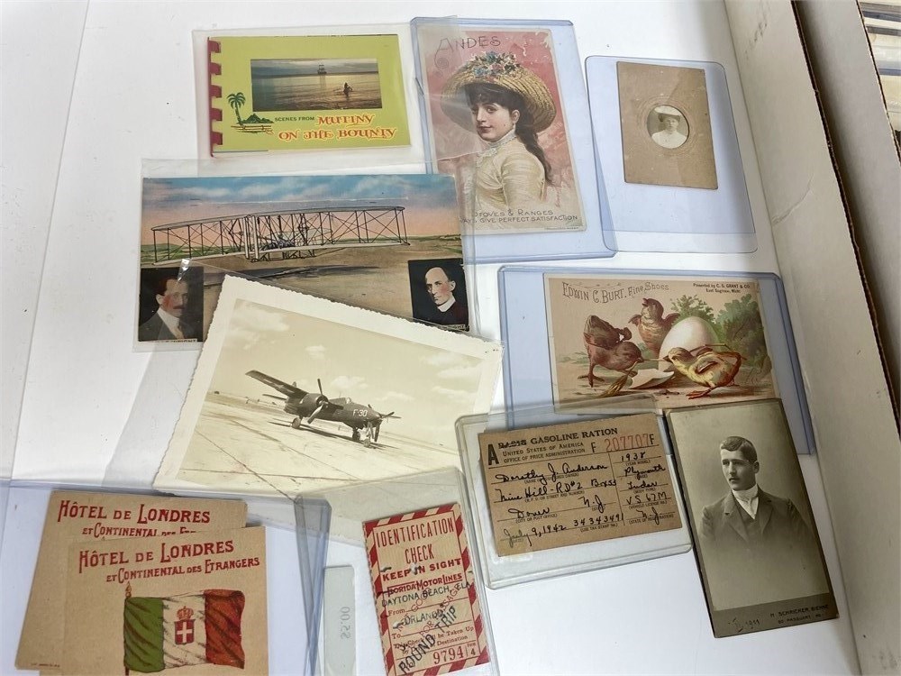 This box is only about half full.  Contents are an interesting mix of collectible paper, Victorian cards, photos, souvenirs, travel items, postcards, folders, advertising items, Asian cards, booklets, etc.