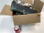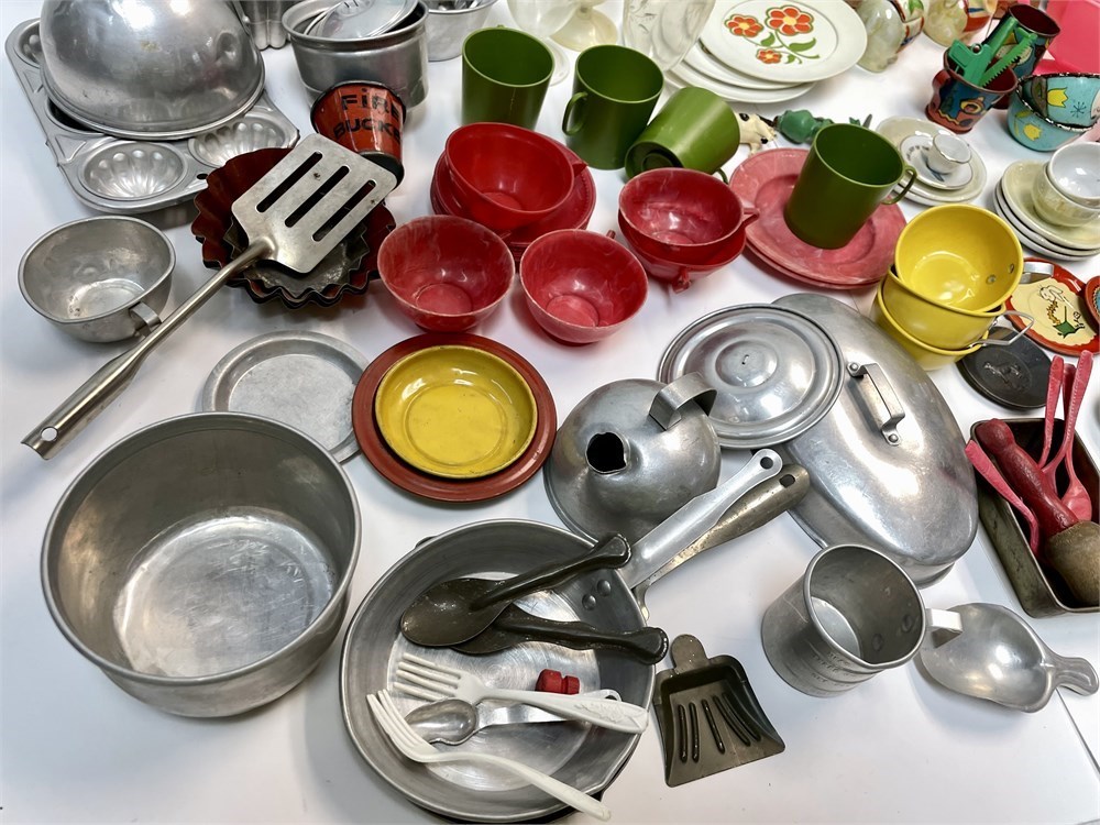 Aluminum ware; other metal toy dishes; some plastic; a few odds and ends; utensils; cookie cutters; trays; pots and pans; even a toy iron.