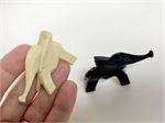Possibly Bakelite; the black one is marked USA.  Less than 2" tall.