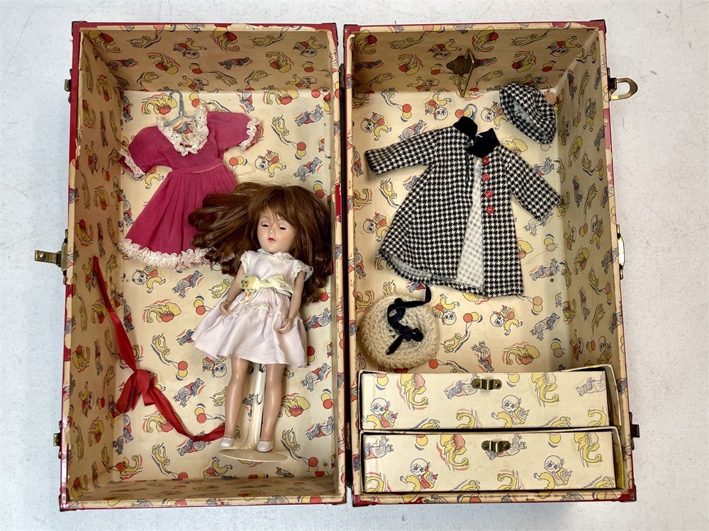 A 12" Teena doll by Valentine dolls, and a couple outfits.  These are in a fairly large red doll trunk with two drawers.