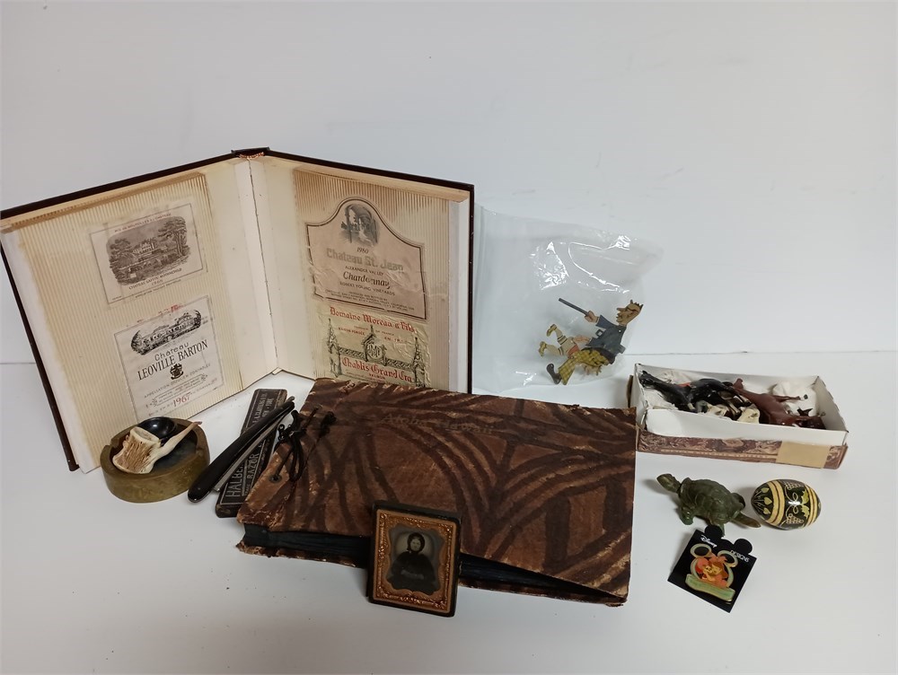Lot includes:  Old photo, old straight razor in box, unusual pipe and ashtray, little toy turtle that bobs his head and tail, an incredible scrap book from early 1900's about travel to Hawaii and more, an album of wine bottle labels, old lead horses and farm animals.