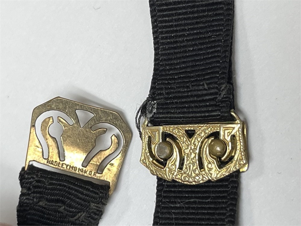 A Victorian mourning brooch (or pendant) with plain black center stone, and gold filled setting (marked).  Plus 2 watch ribbons, one marked Hadley, with gold-filled components.  All 3 pieces for the bid.