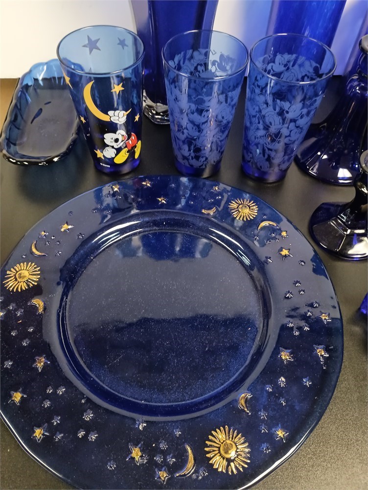 This is a large group of all cobalt blue glassware.  Glasses, candle holders, star shaped dishes, vases, large chop plate, and more.  There are 3 Disney / Mickey Mouse glasses.
