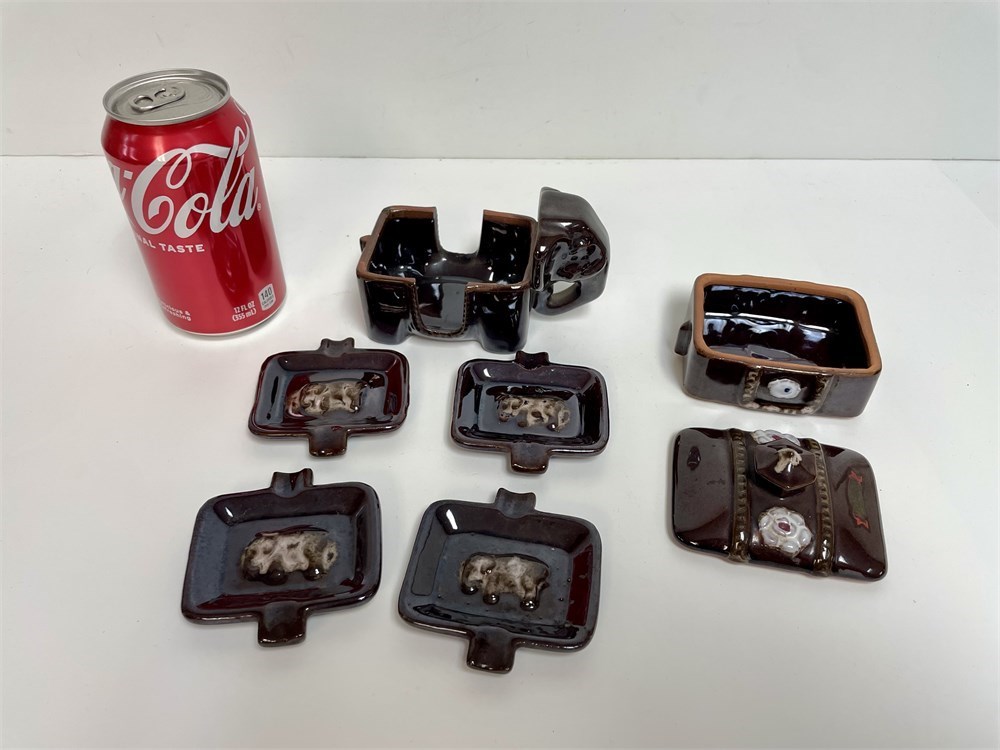 Large hand painted plate; Japan cigarette set with ashtrays and box; heavy resin Chinese elephant; painted wood elephant; modern sequined wall organizer with pockets.  Also a David Mark Creations large resin figure with reattached tusk.  And a quality Lenox figure "Asia Elephants" of mother and calf, missing a tusk on the back side.  Everything for the bid.