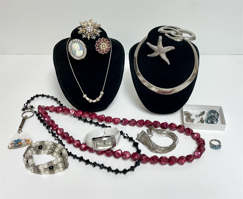 Pretty brooches, a Park Lane silvertone necklace, a starfish pendant/pin, earrings, watch, bracelets, Napier necklace, other pieces.
