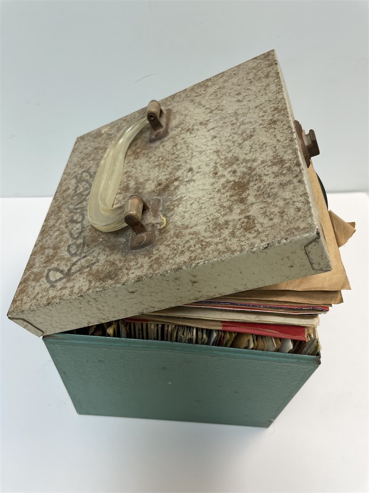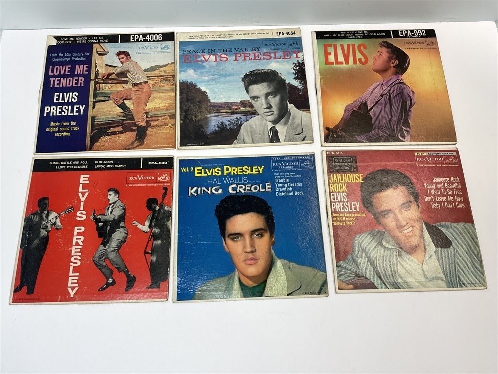 This really looks like a good group of records, from the estate.  Many are sleeved, and many are Elvis Presley.  Others from that era include Conway Twitty, Ricky Nelson, Pat Boone, Johnny Ray, Jerry Lee Lewis, Roy Orbison, many various others.  The case is full plus others overflowing.  You're welcome to look through them on Preview Day (Sat., 12-5 pm).