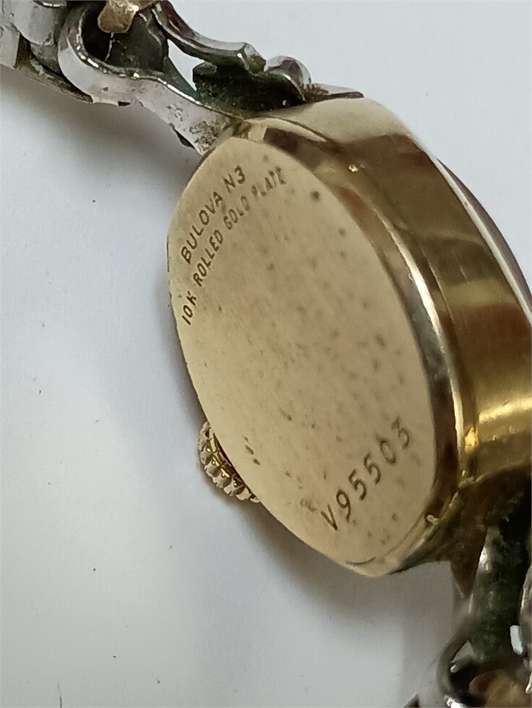 Impressive 23 J Ladies watch by Bulova.  Running condition.  Case is 10K gold filled and watch band tops are gold filled.  Very clean and looks great.  The diamonds are tiny.