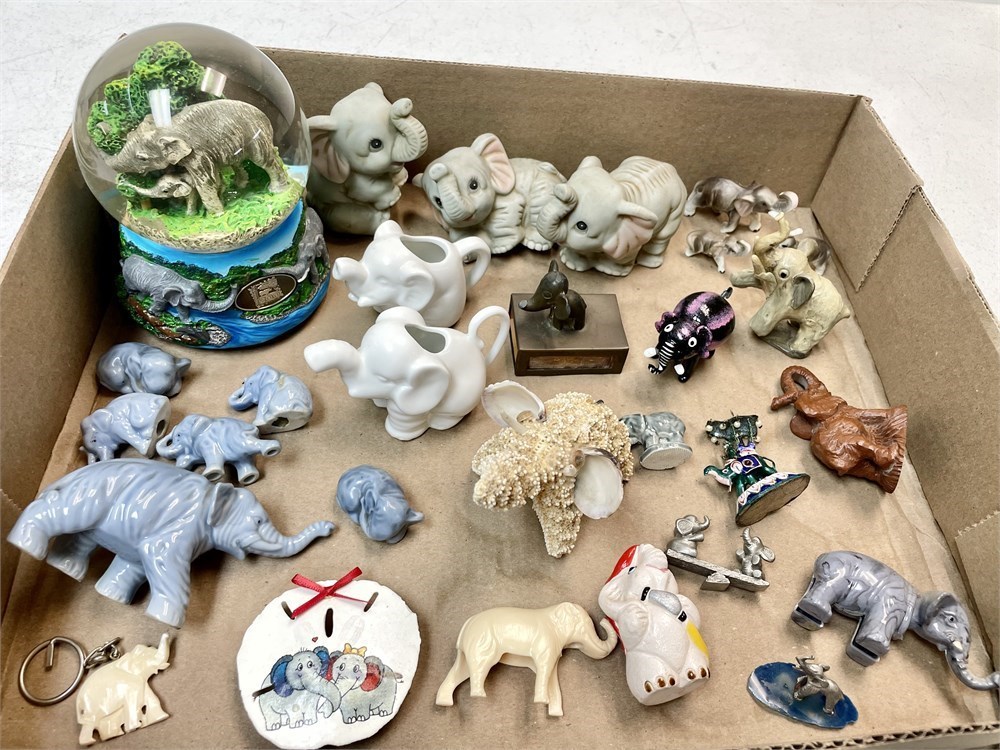 Lots of little goodies, all are elephants of some kind.  Pewter, early plastic, a Japan pottery elephant family, a water ball snowglobe, various types and even an elephant made from a starfish.