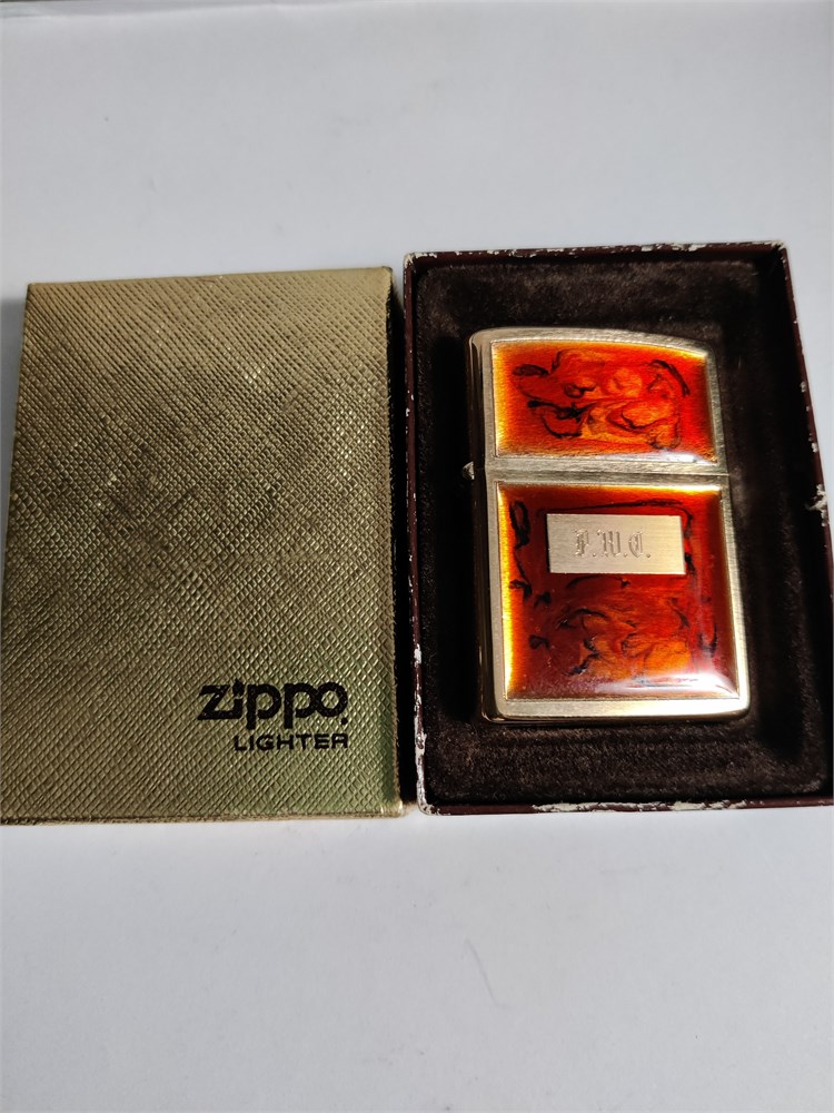 ZIPPO PLASTIC AMBER COATED BRASS LIGHTER IN ORIGINAL BOX USA. Comes with Zippo box but I do not believe this is the original box for this lighter. It doesn't look like this lighter was ever used.