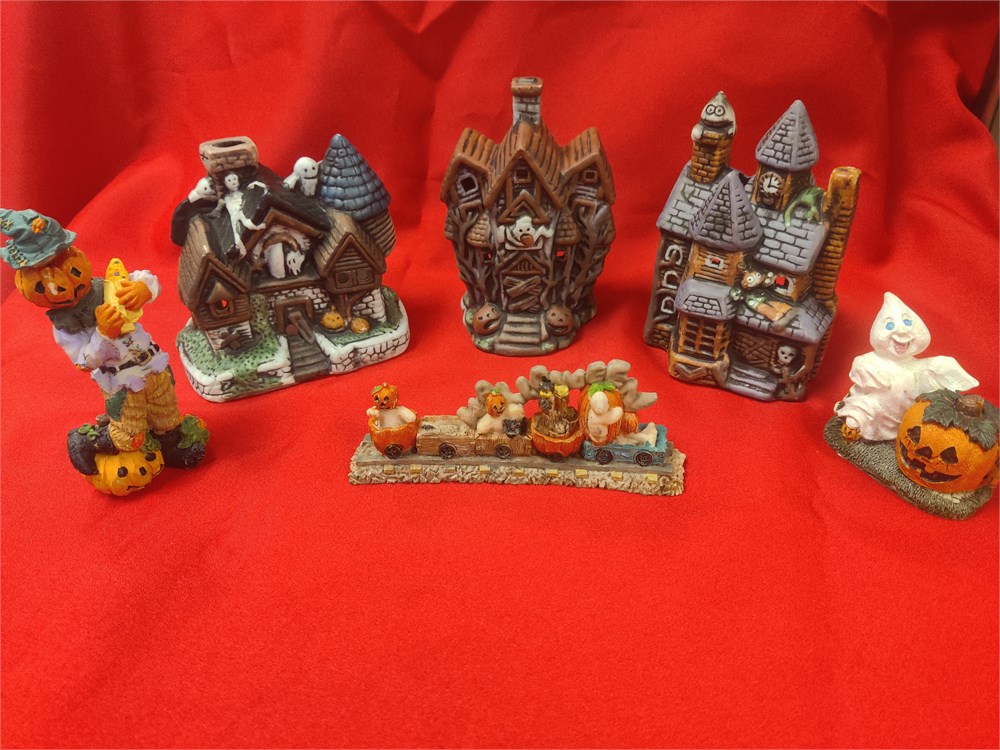 Nice and little lot of six Halloween decorations. Includes three small houses and three additional pieces. All look to be in good condition.