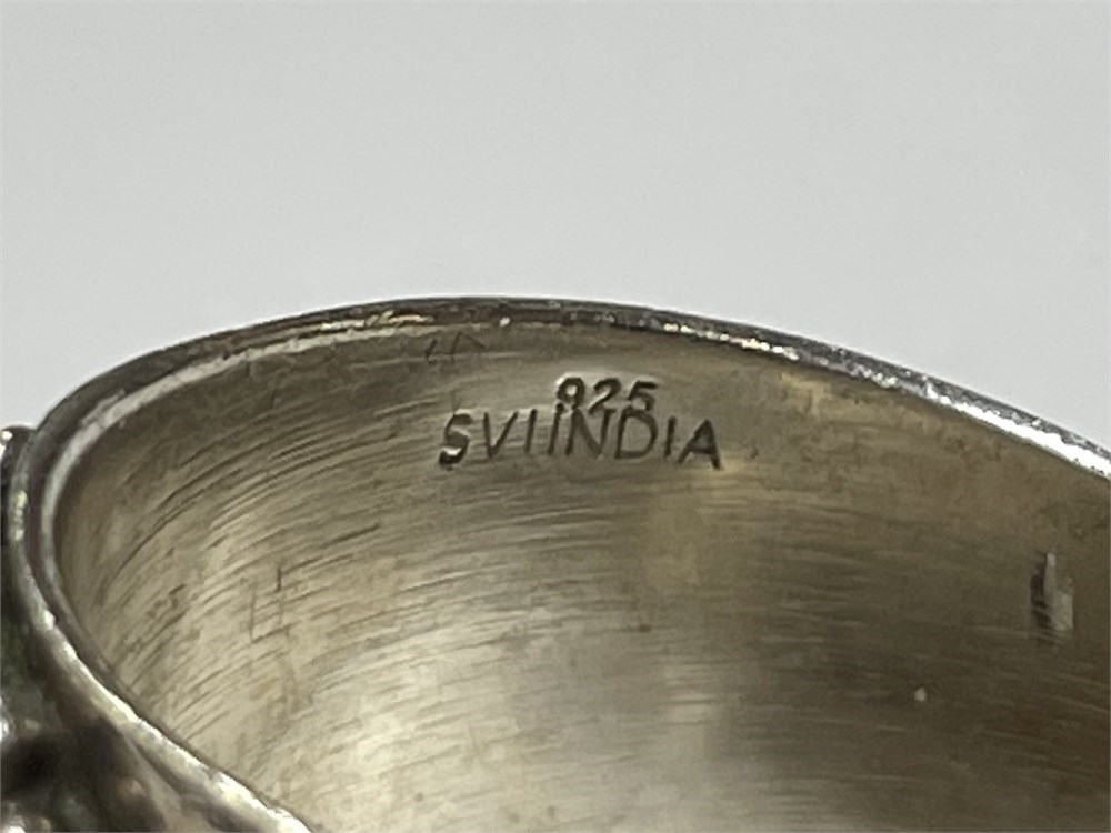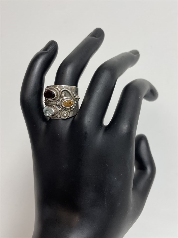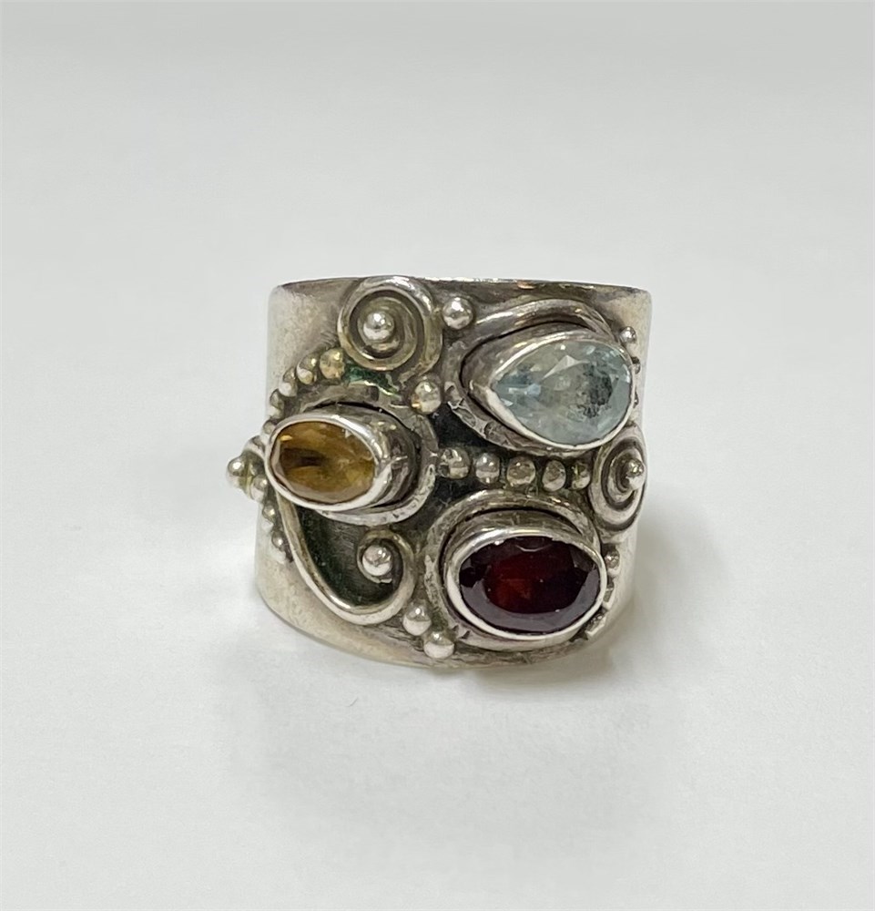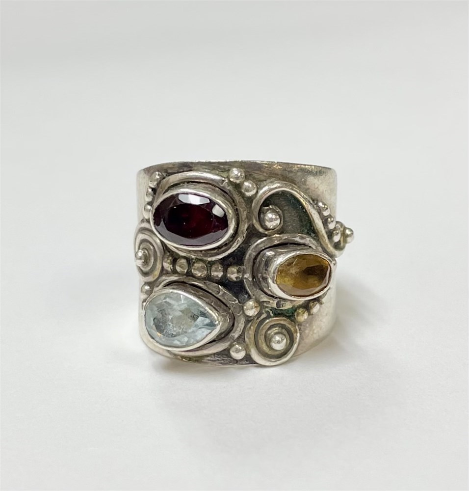 Marked 925, SVI, India.  Real gems: garnet, amethyst, citrine (or similar, see photo of meter) in a traditional detailed design.