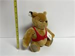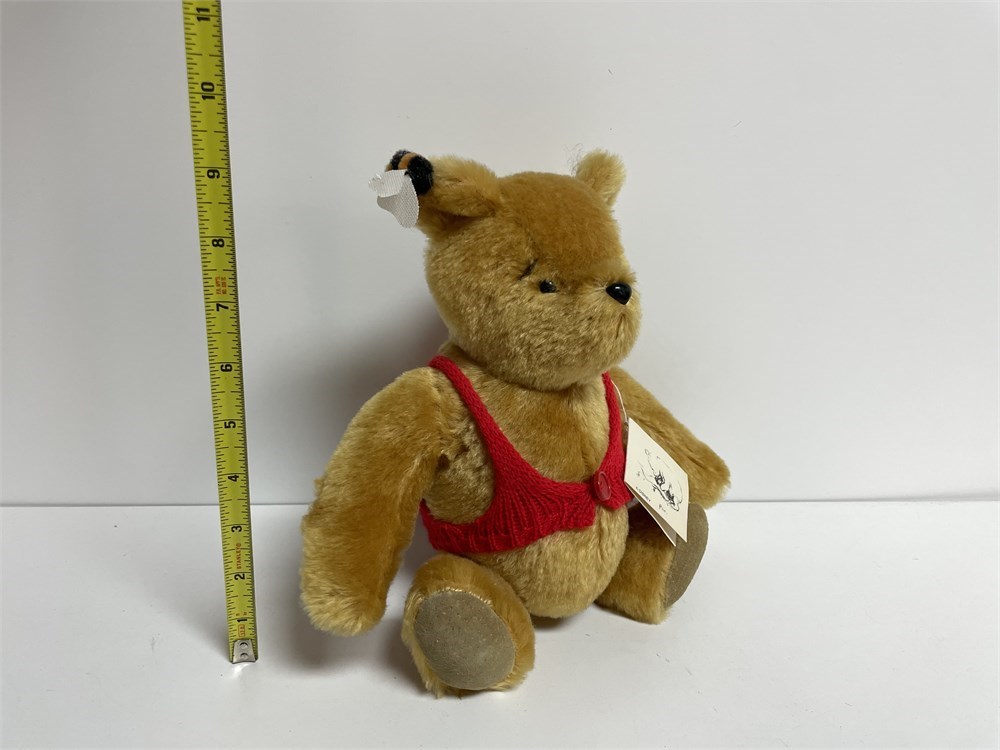 An articulated Winnie the Pooh bear, with Gabrielle hang tag, and a label that includes "Disney."  About 9" tall when seated.