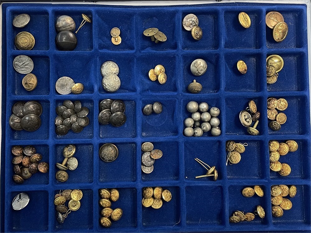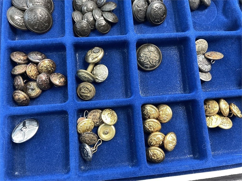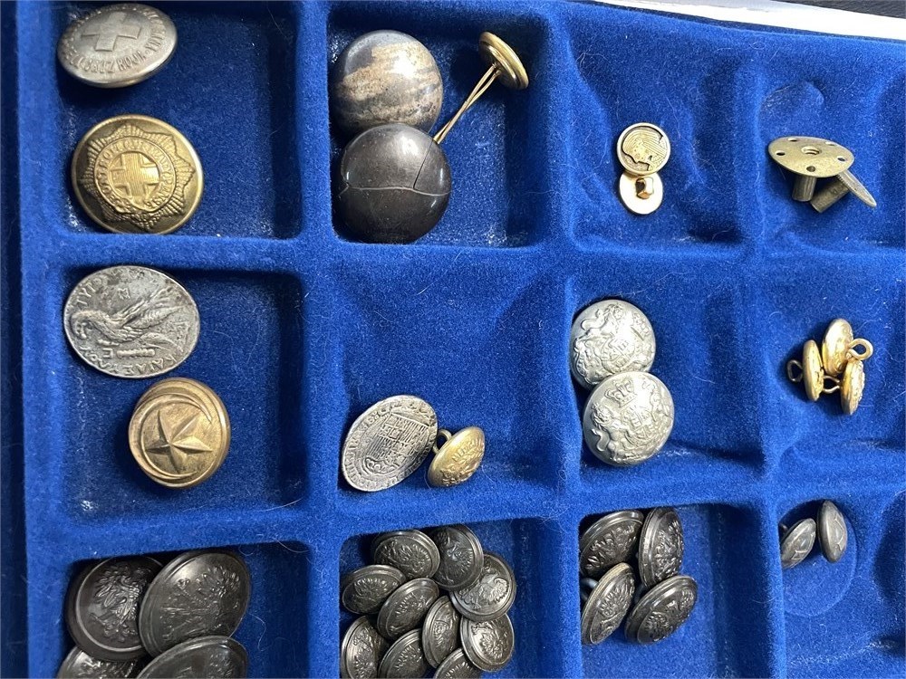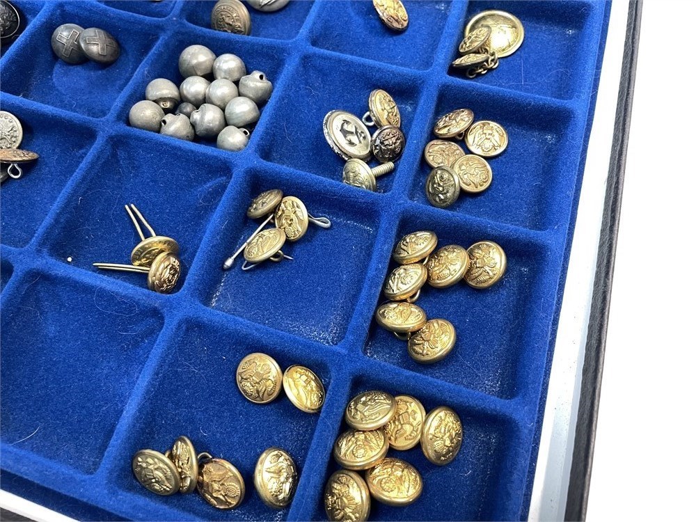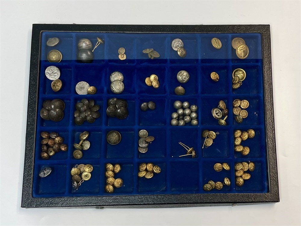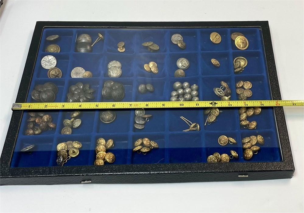 Assorted military buttons; scroll through photos to see them.  Plus the nice glass-top sectioned case.
