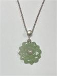 A carved jadeite stone flower with real pearl center, on a sterling silver chain.  Both marked 925.