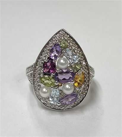 Marked 925.  A pretty and colorful ring, full of various semi-precious gems and pearls, making a teardrop shape.