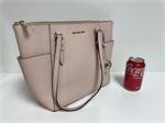A light pink handbag, big and roomy and in good general condition.  It has been carried but still has lots of life left.  Also a smaller zip wristlet wallet, normal used condition.