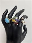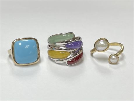 All are marked 925.  A wraparound gold vermeil ring with two real pearls (size 7 1/2); a gilt silver blue cabochon ring (size 7); and a multi-stone modern ring (size 8).  Pretty group.