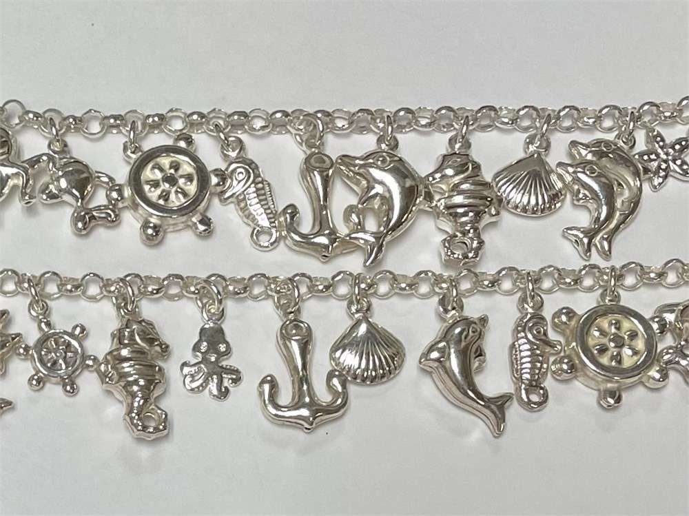 A super cute necklace and bracelet set with many different sea creatures and beach-themed charms.  Dolphins, starfish, crabs, seashells, sea horses, fish, and more!  Both are marked 925 for sterling silver.  Ready to wear or gift.