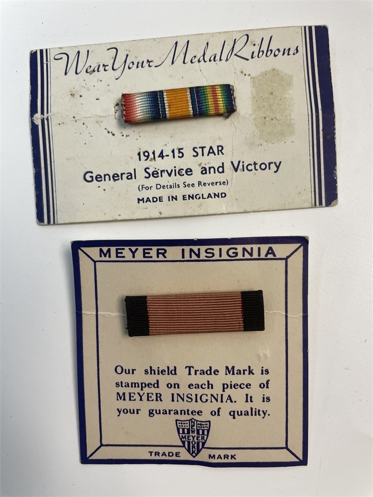 About 40 pieces of N.S. Meyer new-old-stock military pins and bars and insignia, in original packaging.  United Nations, Korea, Bronze Star, Gold Star, Navy P.U.C., others, and some are sterling silver.  Also in the lot is some cording and a sword knot.