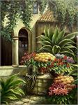 A beautiful oil on canvas painting of tropical plants outside a Florida home, with a pretty frame.  Signed Walker.  Condition: There is a dent in the canvas.  Everything else about it looks fine.