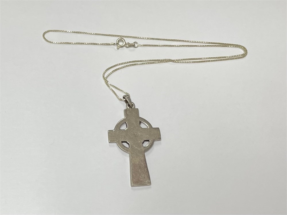 A classic Celtic Cross pendant on an 18" Italian chain.  Both pendant and chain are marked as sterling/925, although the cross mark is quite hard to read.