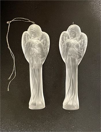 2 slender frosted glass angels, alike except the hang cord.  Both are marked for Baccarat on the base, see photo.  No damage.  About 4" long.