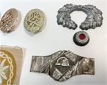 Hat pins, a shoulder rank, a plaster impression of an award, a Nickel Silver bar, a patch, other items.  We have not researched the authenticity of any of these.  Entire group for the bid.
