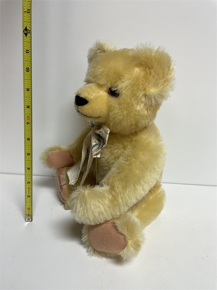 A numbered Hermann mohair bear with embroidered foot: German Christmas Bear, Nr. 0508.  It has a Hermann hang tag and wears a bow.  Also a metal tag on the back of the head.  About 11.5" tall when seated.