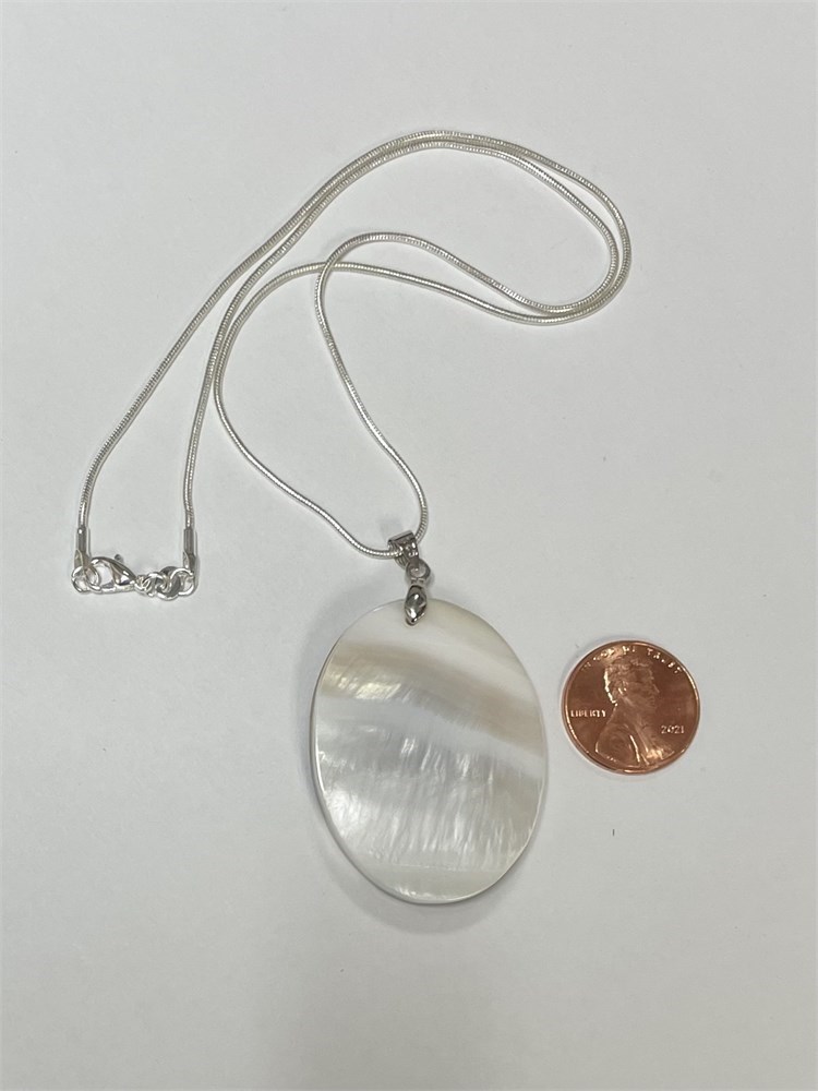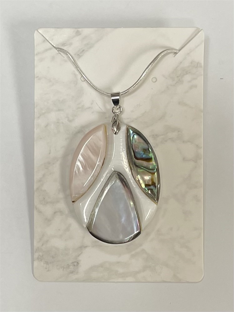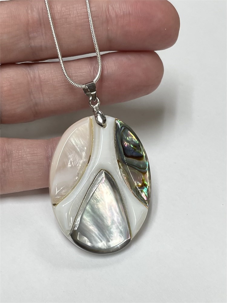 A modern pendant with pretty colors, featuring mother of pearl and abalone.  It's on an 18" chain.  Although this is marked 925, it is not testing as sterling.