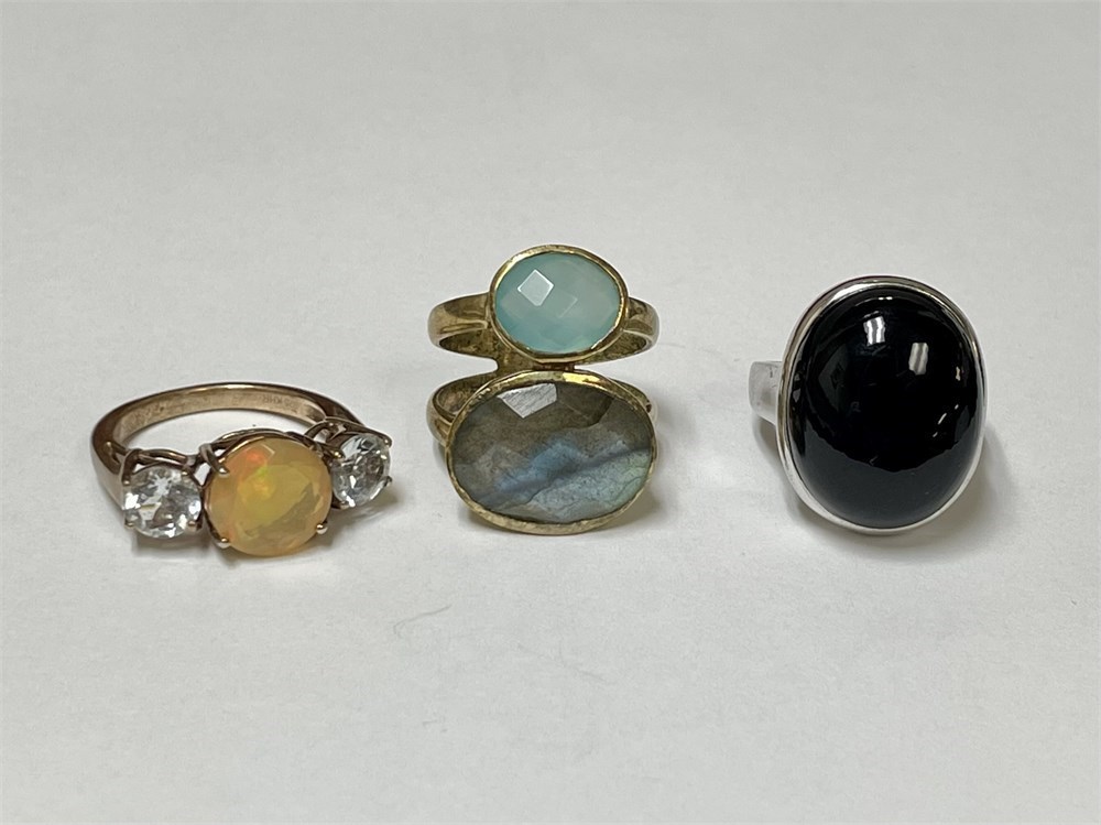 Lot includes: An interesting yellow opal ring with various colors seen in it; a fluorite and calcedony ring; and a black onyx cabochon ring.  Stones identified to best of our ability but bid according to your own opinion.