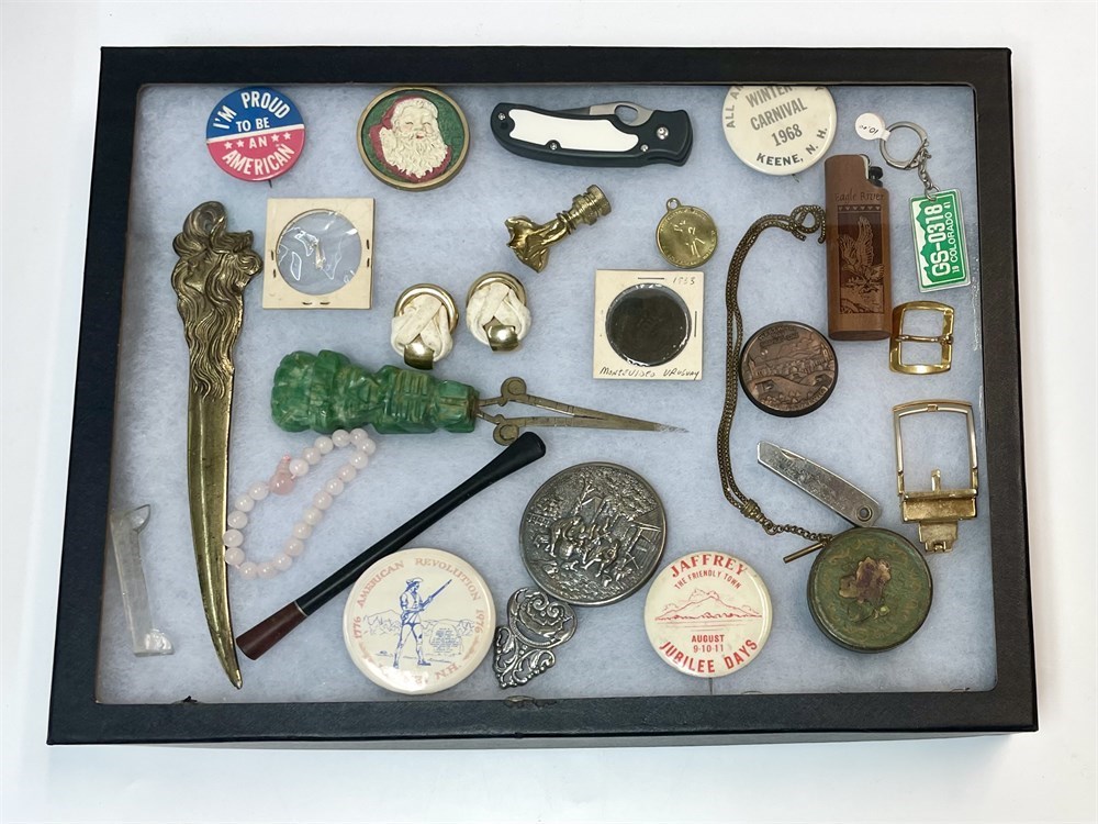Assorted collectibles, green stone letter opener, purse mirror, promotional buttons, cigarette holder and lighter, and more.  Plus the glass-top display case, and notice it is an extra-deep one for larger things.