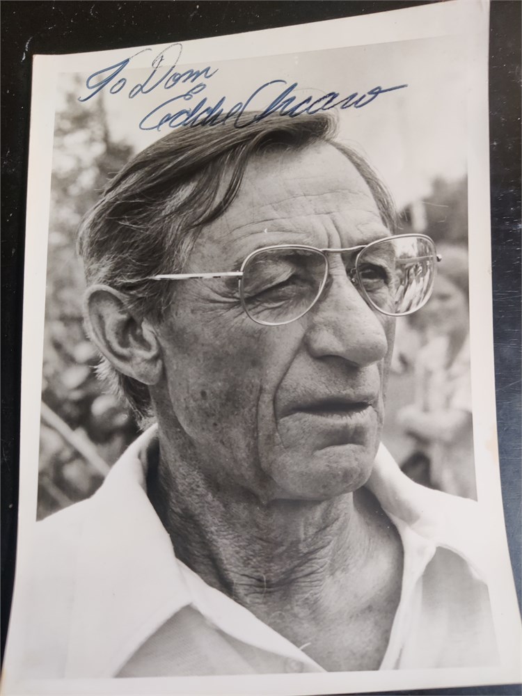 Black and white autographed photo of Jockey Eddie Arcaro. This is another piece from the New York Giants photographers collection. All autographs are made to Dom.