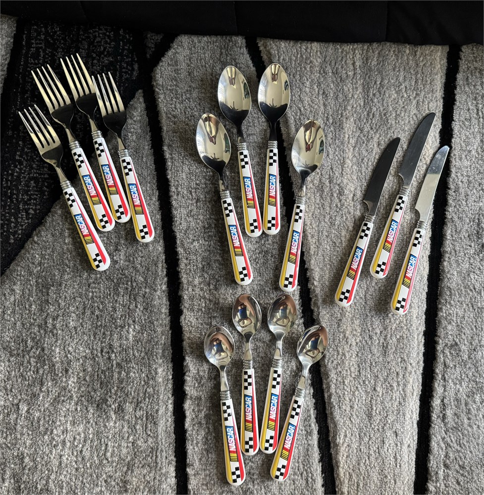 15pcs plastic handle Gibson plastic handle flatware Victory NASCAR set. Almost complete 4 service set, missing one butter knife. Excellent condition, no box. Set includes: four (4) Dinner forks, four (4) serving spoons, four (4) dessert spoons and three (3) butter knives.
