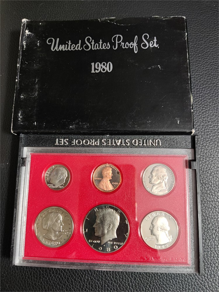 1980 S United States proof set. Comes with six coins sealed in hard plastic case. Outside box has some damage.