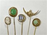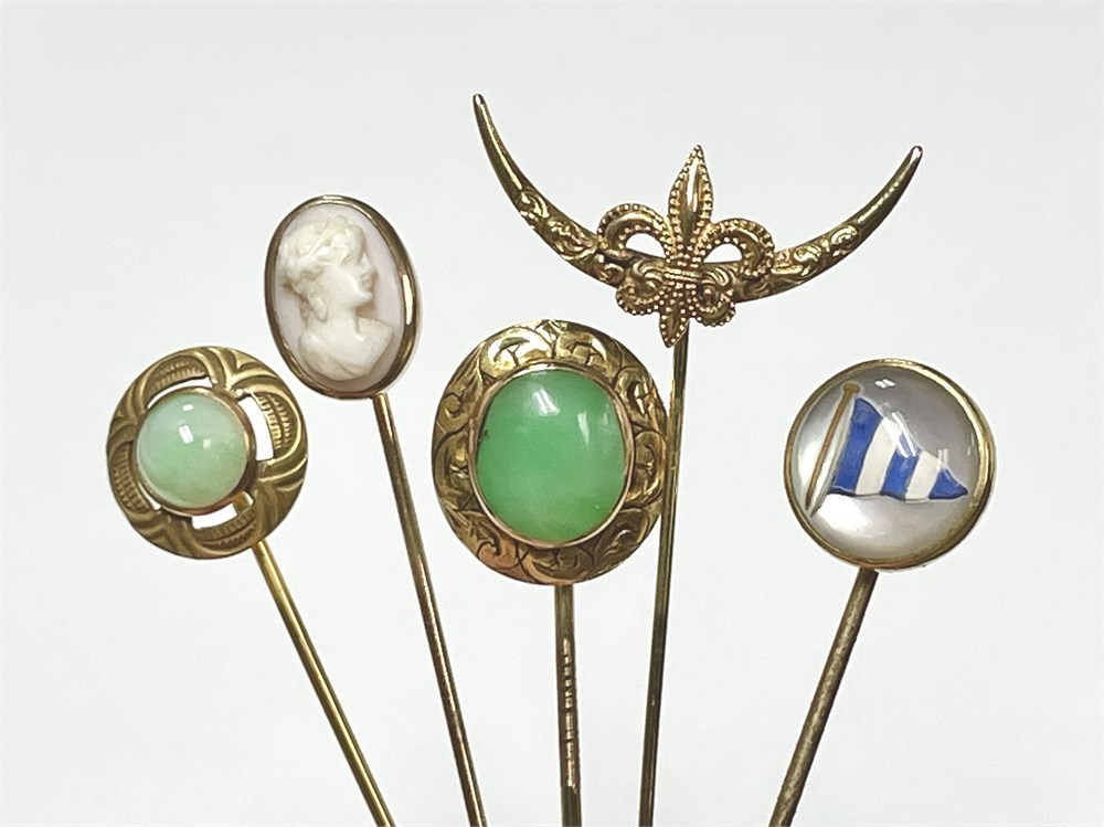 5 stick pins including cameo, green stones, fleur-de-lis on crescent, and a flag cabochon.  All are marked as 14K gold.  Nice group.