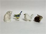 4 small figures; the tallest is the cat at 3.25".  Marked as pictured, for Goebel, W. Germany.  All in good condition except the white bird which is chipped.  Blue Titmouse, white "Mitzi" cat, small bunny rabbit, white bird with gold trim.